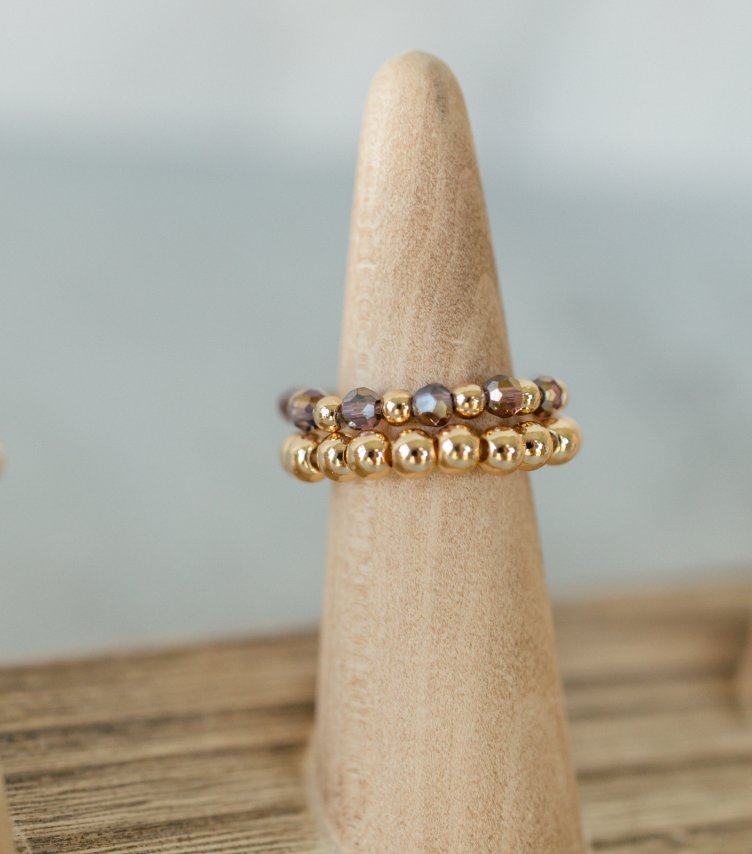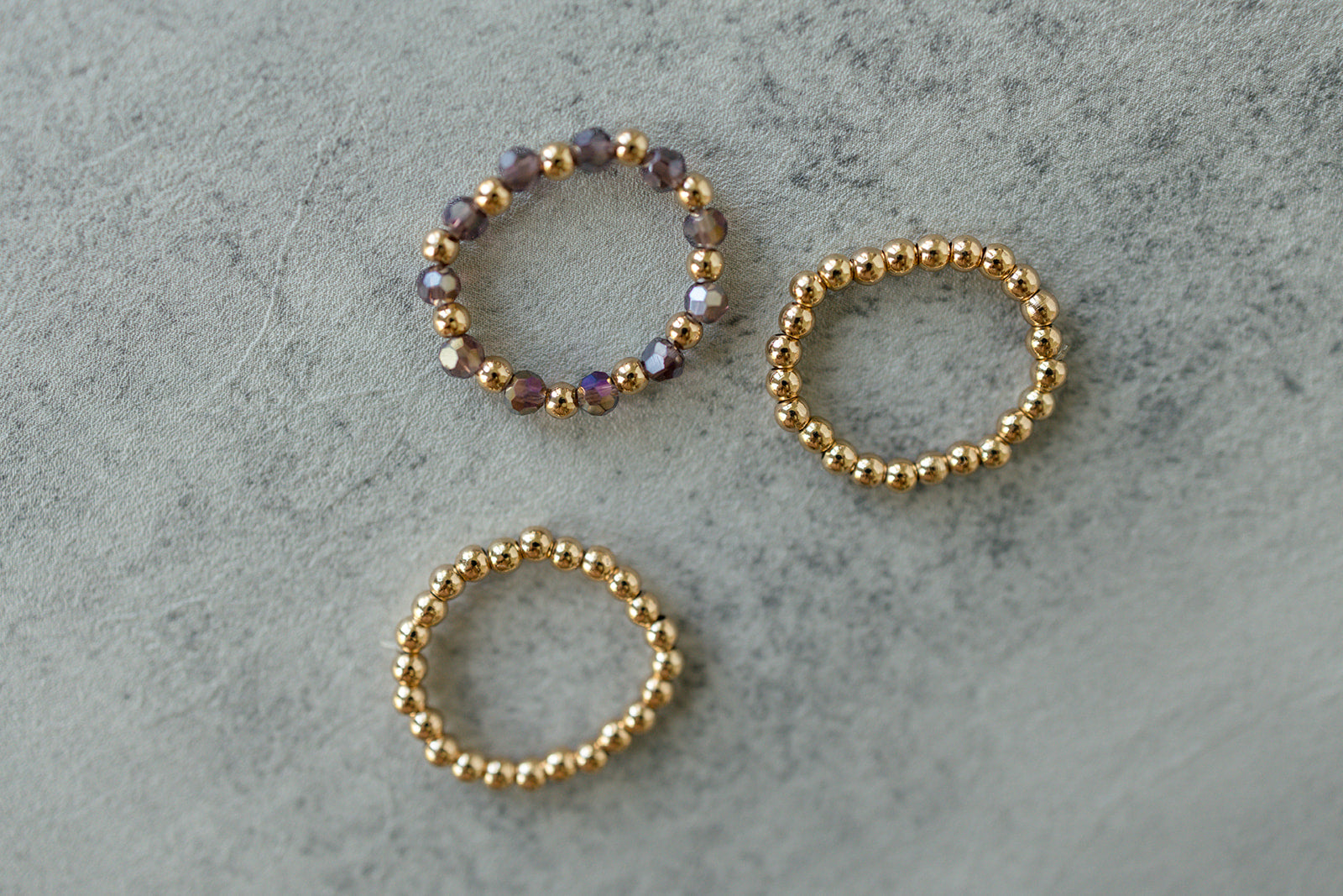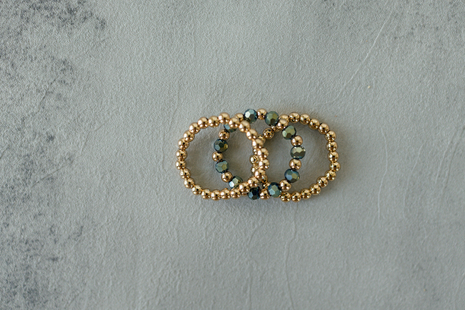 Meet our Cleopatra Ring Set – a trio of rings that effortlessly blend elegance and modern allure. Featuring two chic gold beaded rings with gold overlay brass base beads, this set exudes contemporary charm. The focal point is the third ring, showcasing vibrant glass beads alongside gold beads. Crafted with meticulous attention to detail and strung on sturdy 0.5mm elastic, this ring set invites you to express your unique style through the captivating fusion of ancient inspiration and present-day flair.