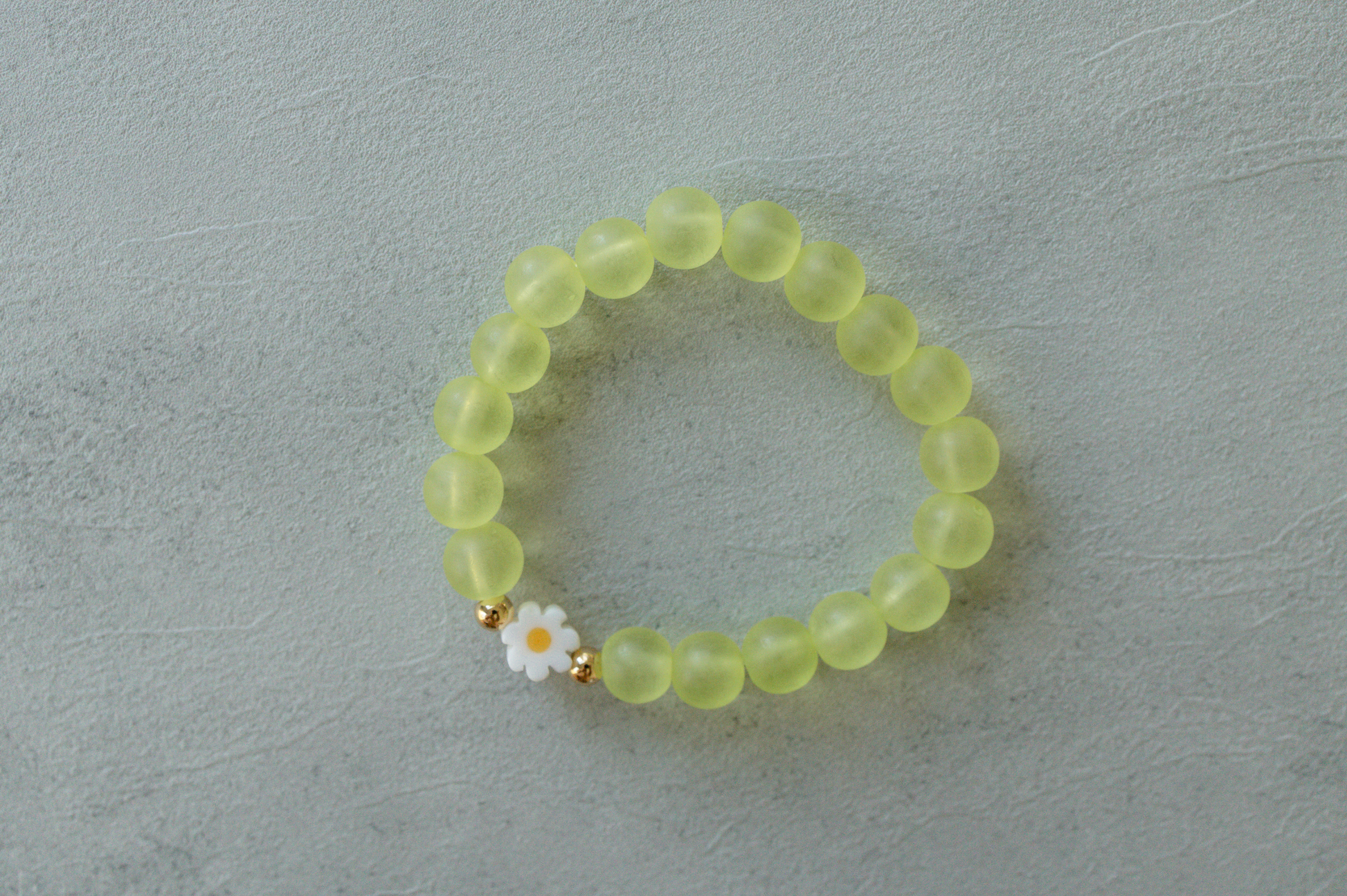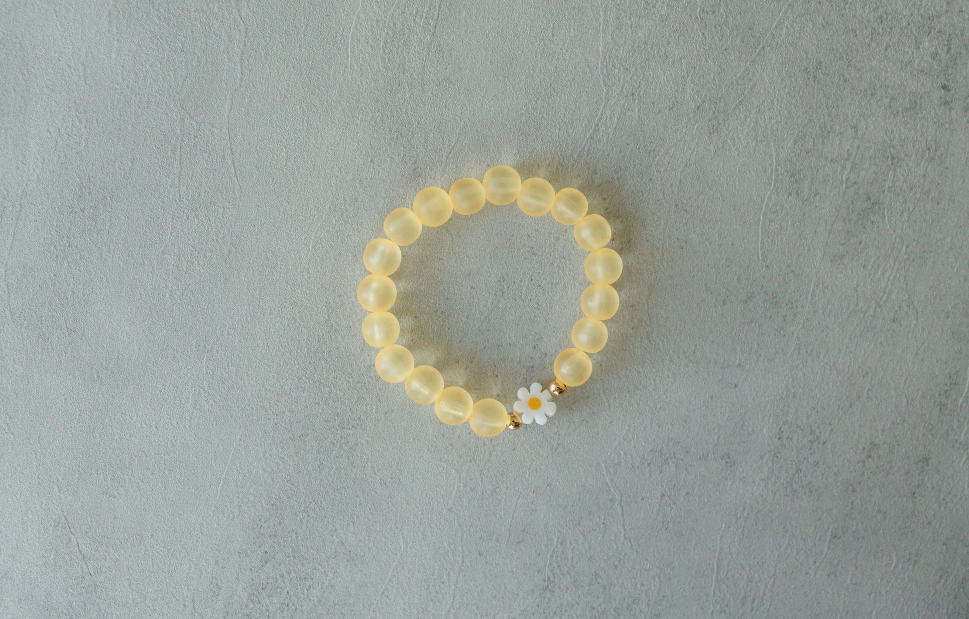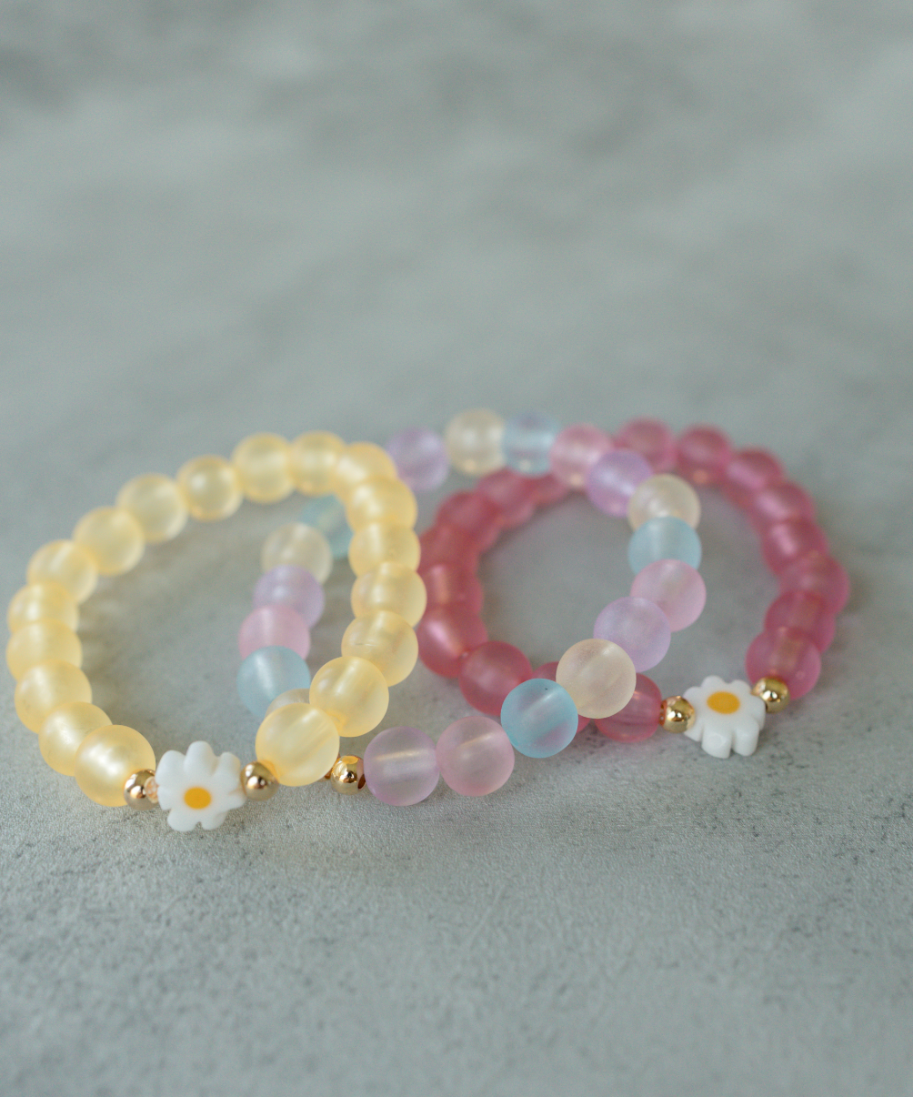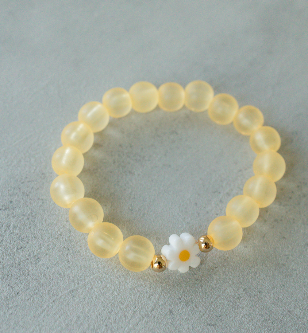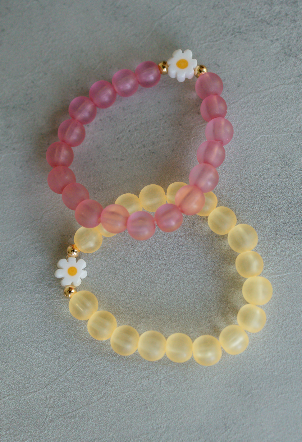 Introducing our "Daisy Delight Kid's Bracelets", an enchanting array of vibrant accessories designed to add a burst of color and cheer to your child's outfits. Each bracelet is adorned with charming yellow and pink beads, accentuated by a delightful daisy flower bead that serves as the centerpiece. These bracelets, part of our exciting collection, come in a rainbow of five different colors for your little one to choose from and mix and match. Crafted with the joy and whimsy of childhood in mind, these Daisy Delight Kid's Bracelets are sure to captivate your child's imagination and become a favorite accessory!