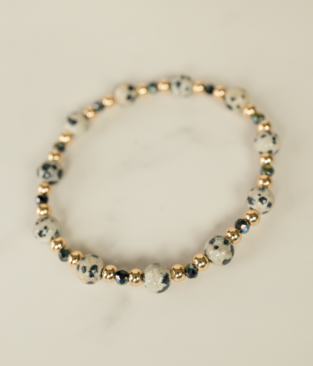 Adorn your wrist with the captivating Gilded Dalmatian Jasper Bracelet from Avalon Days. Featuring genuine Dalmatian Jasper beads, each piece is a unique masterpiece, showcasing the stone's intricate patterns. The warmth of gold-overlaid brass base beads adds a touch of opulence, while rondelle-cut black glass beads bring a subtle contrast. Elevate your look with the Gilded Dalmatian Jasper Bracelet!
