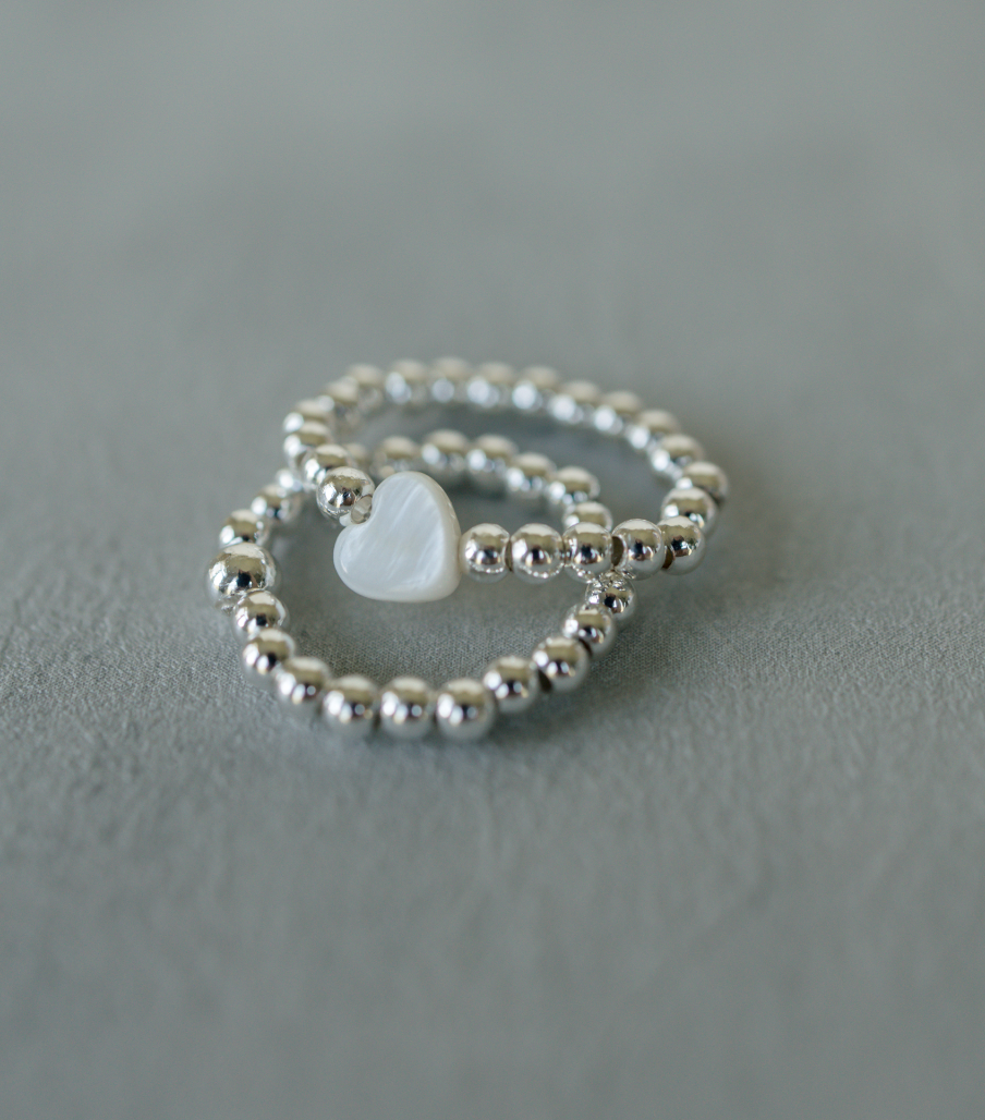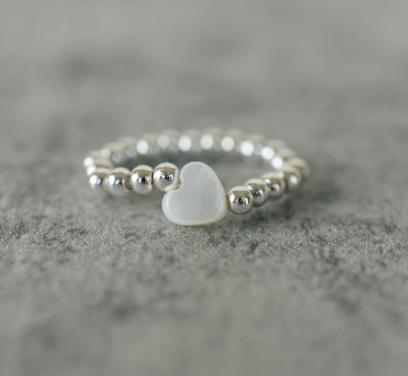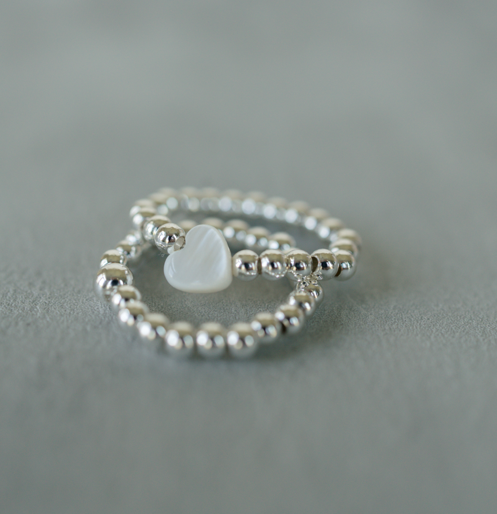 Introducing the Heart of Silver, a stunning silver ring featuring a beautiful white heart-shaped bead. This elegant piece is double-strung on a durable .5mm elastic, ensuring a comfortable fit for all. The silver beads are crafted with stainless steel and finished with a silver overlay, adding a touch of sophistication to this timeless accessory. Perfect for any occasion, the Heart of Silver is a must-have addition to your jewelry collection.