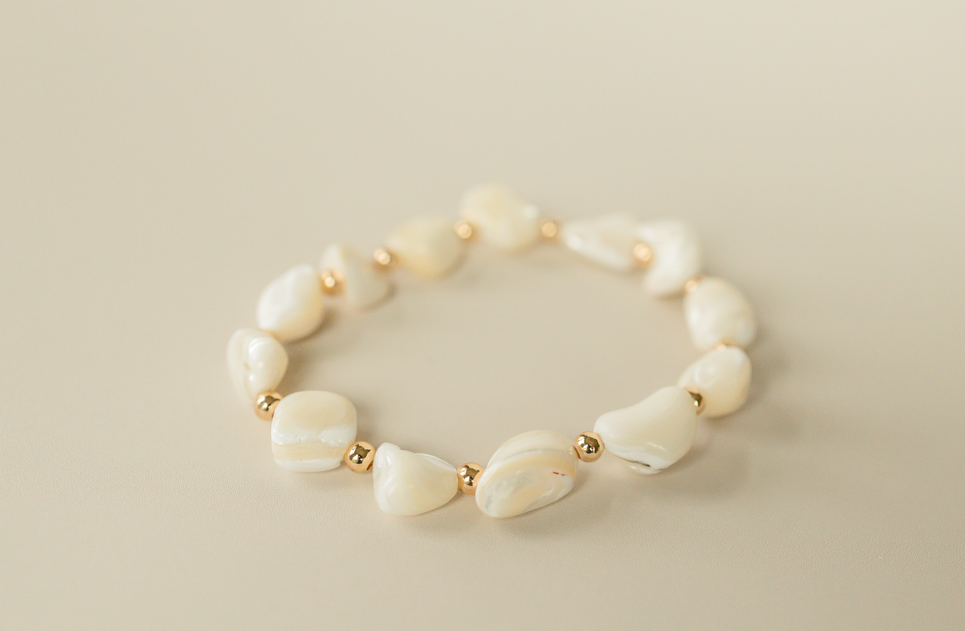 Discover the ethereal beauty of Avalon Days' Ivory Shell Beaded Bracelet. This bracelet features 8mm irregular shell beads, gracefully interspersed with gold-overlaid brass base beads., a testament to the artistry and passion woven into every Avalon Days creation. The Ivory Shell Beaded Bracelet whispers tales of the sea and timeless sophistication!