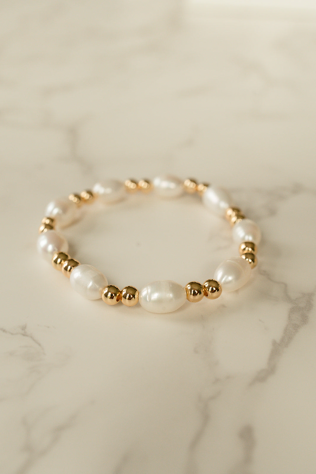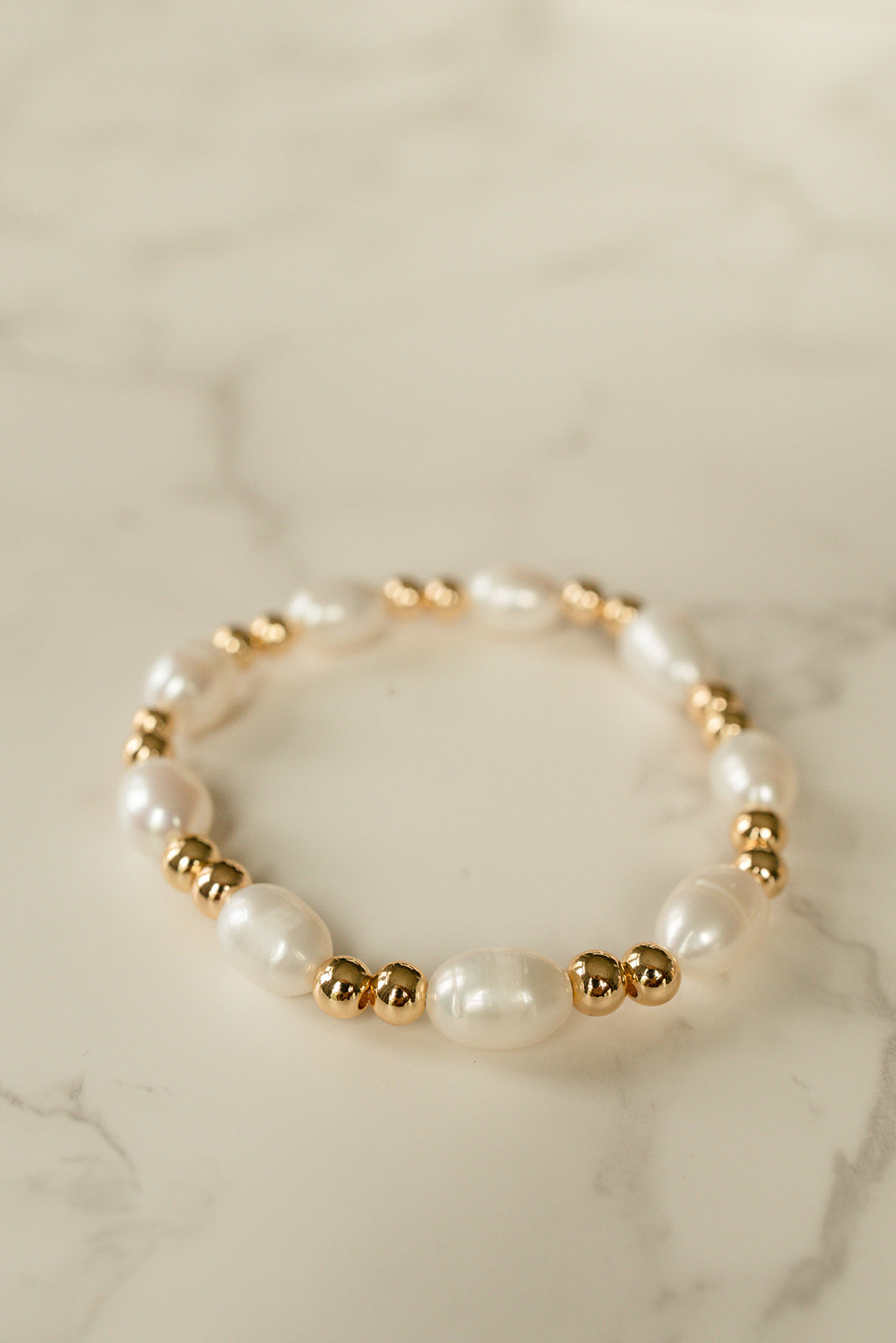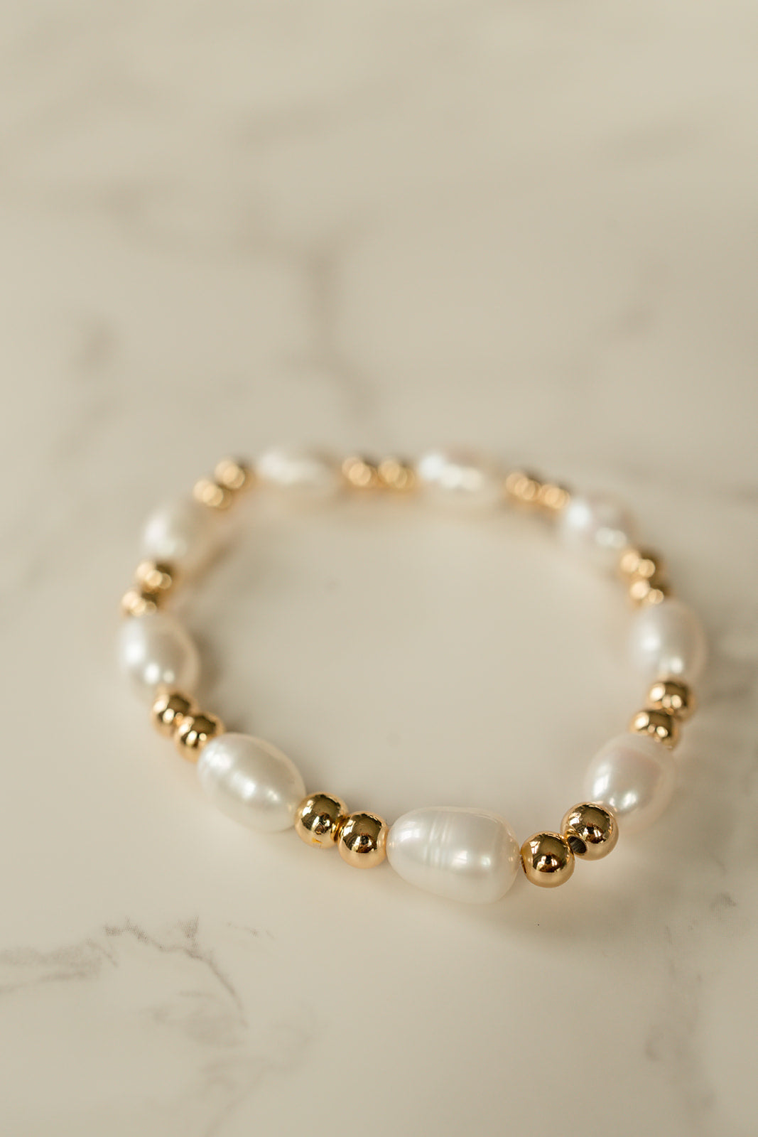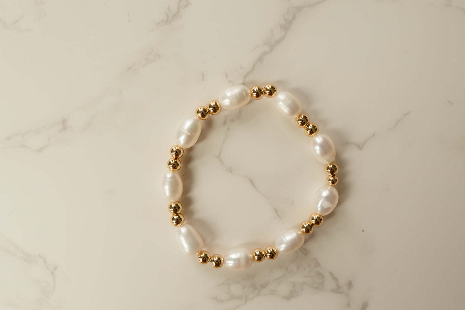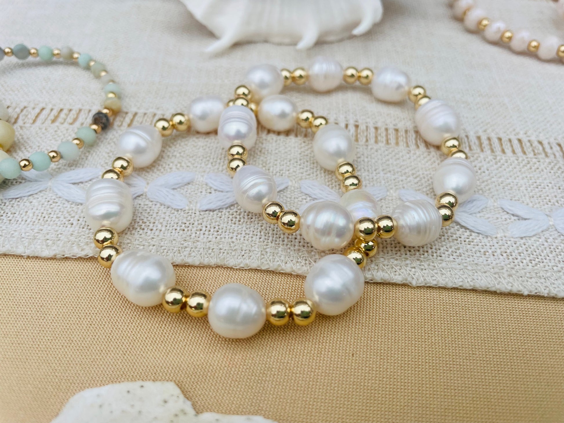 Our Luxe Pearl Bracelet is a must-have accessory for those seeking a touch of timeless elegance and modern sophistication. This stunning piece boasts lustrous freshwater pearls, delicately paired with brass base beads embellished with a luxurious gold overlay. Meticulously crafted, this bracelet exudes a sense of luxury and refinement, making it the perfect addition to any outfit for any occasion. Elevate your style and make a statement with our Luxe Pearl Bracelet.
