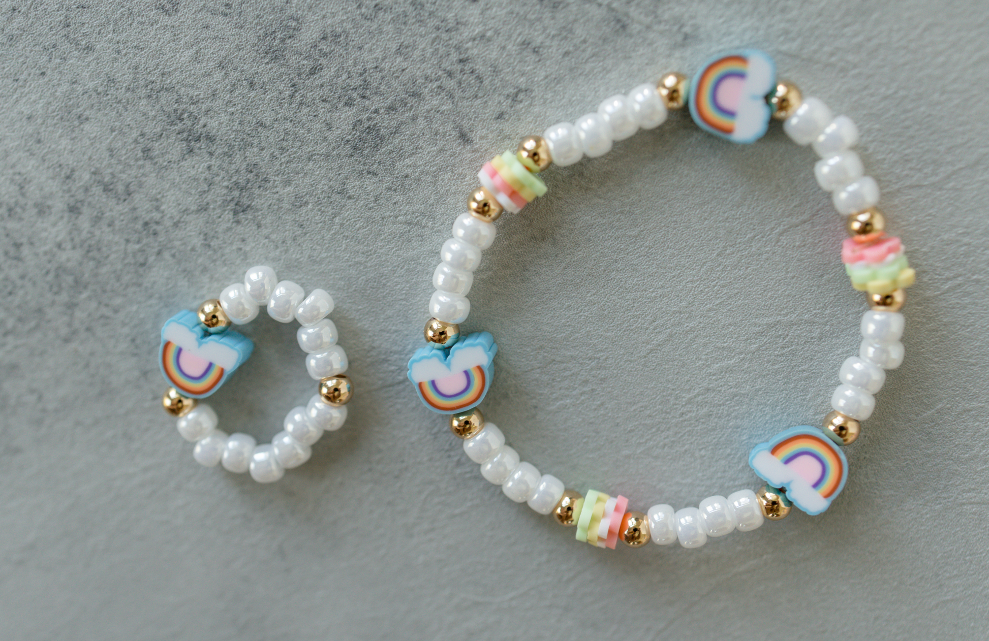 Introducing our magical Over the Rainbow Kids Ring! This enchanting ring features a vibrant rainbow and a lustrous white beads, creating a delightful combination that will captivate any child's imagination. Crafted with durability in mind, it's double-strung on a sturdy .5mm elastic string, ensuring a perfect fit for all little fingers. With its one-size-fits-all design, this adorable ring is ready to bring joy and color to every child's day. Let their imagination soar and their style shine with the Over the Rainbow Kids Ring!