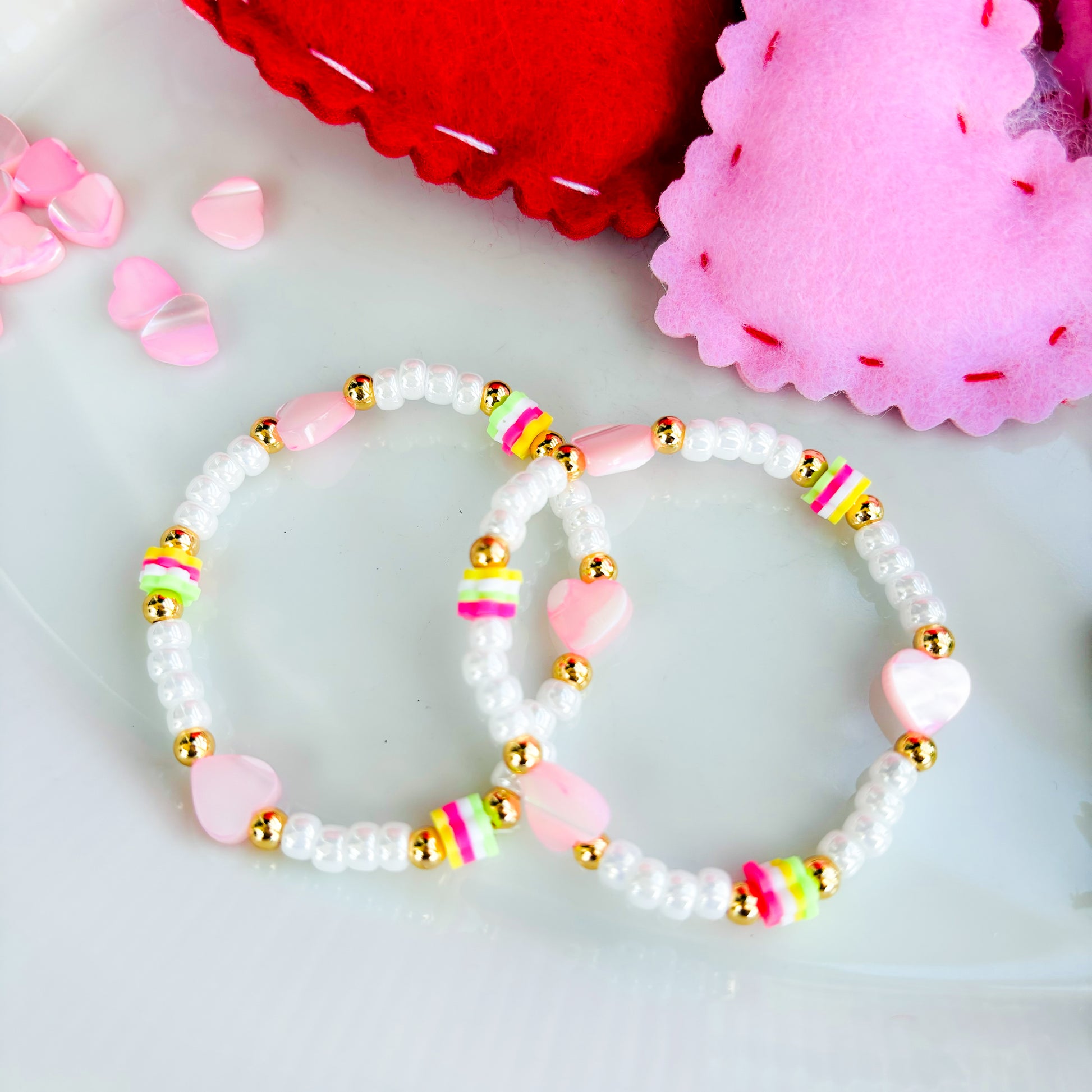 Make their heart skip a beat with this charming Pink Heart Kids Bracelet from Avalon Days! This sweet accessory features white pearlescent seed beads, three pink heart beads, gold overlaid brass base beads, and pops of color for a playful look. With its delicate details and bright hues, this bracelet is sure to delight. The three petite heart beads are classically cute, while the white and gold beads add a touch of elegance. Surprise them with this unique handmade gift that will make them feel loved every time they wear it.